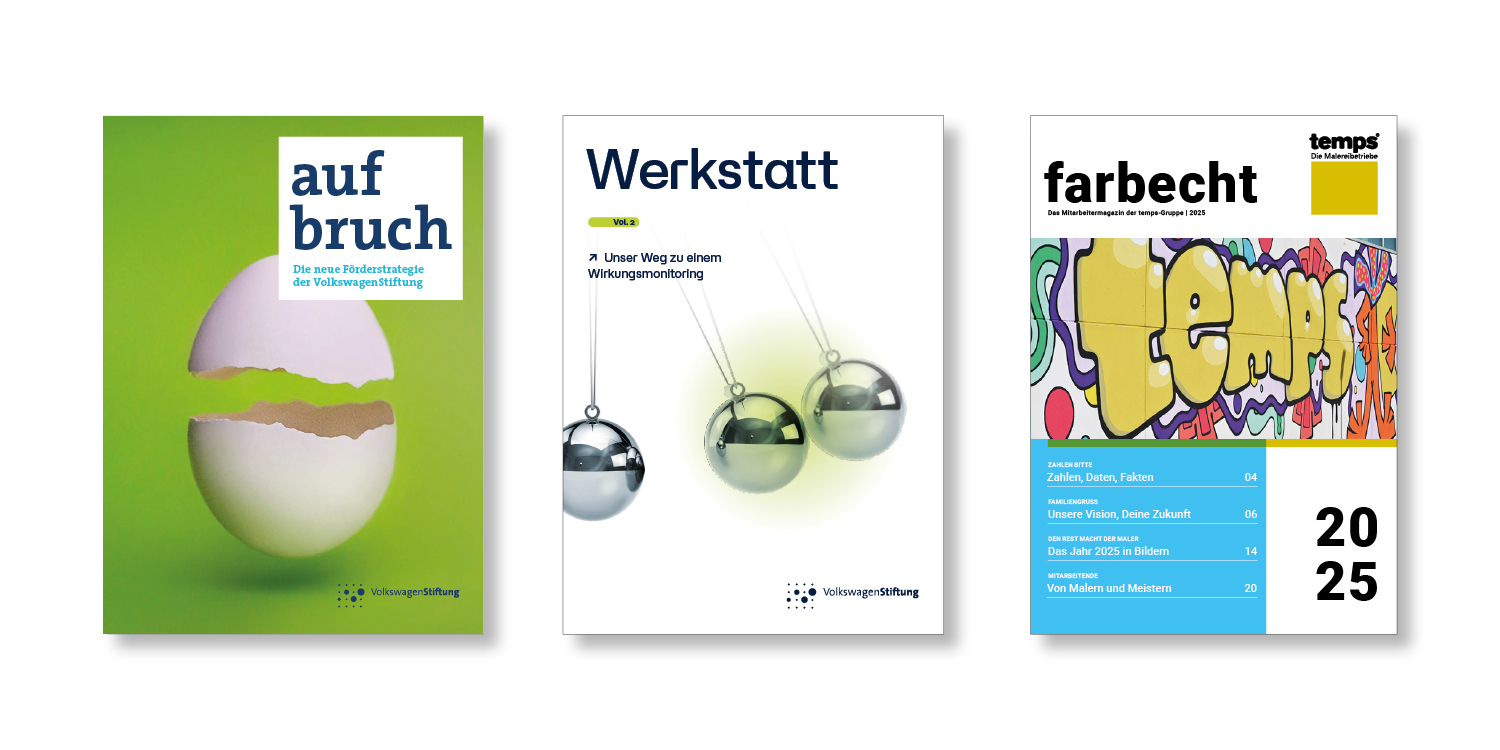 Alles wird gut, denn Göttin Europa hat Bulle und Bär fest im Griff! Die KI macht’s möglich und erzeugt manch verblüffende Illusion. Aber auch ganz seriöse wissenschaftliche Publikationen der Volkswagenstiftung gehören zu unserem Repertoire – ebenso wie der farbenfrohe Jahresbericht der temps-Malereibetriebe oder die komplette Marketing-Range der bundesweit mit Kindern lesenden Lesementoren. „Form follows function”, wie der Designer sagt, oder, wie Kant es sagt, „Sapere aude! Habe Mut, dich deines eigenen Verstandes zu bedienen”. Oder: „Wir gestalten so lange, bis es gut ist”, wie es die Männer + Mäuse sagen.